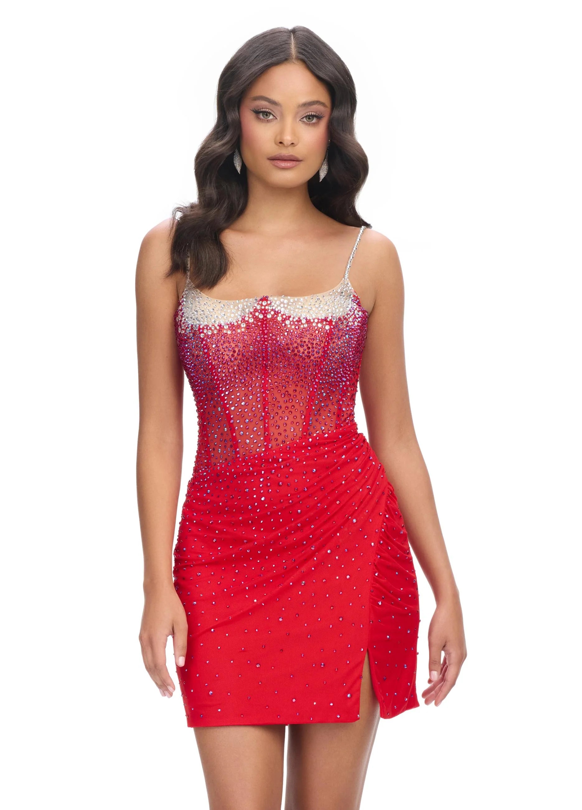 Say 'Hello' to feeling fabulous! This stunning cocktail dress features a press on bustier that trickles down the skirt. With its illusion neckline and side slit, this dress is sure to turn heads at any event!