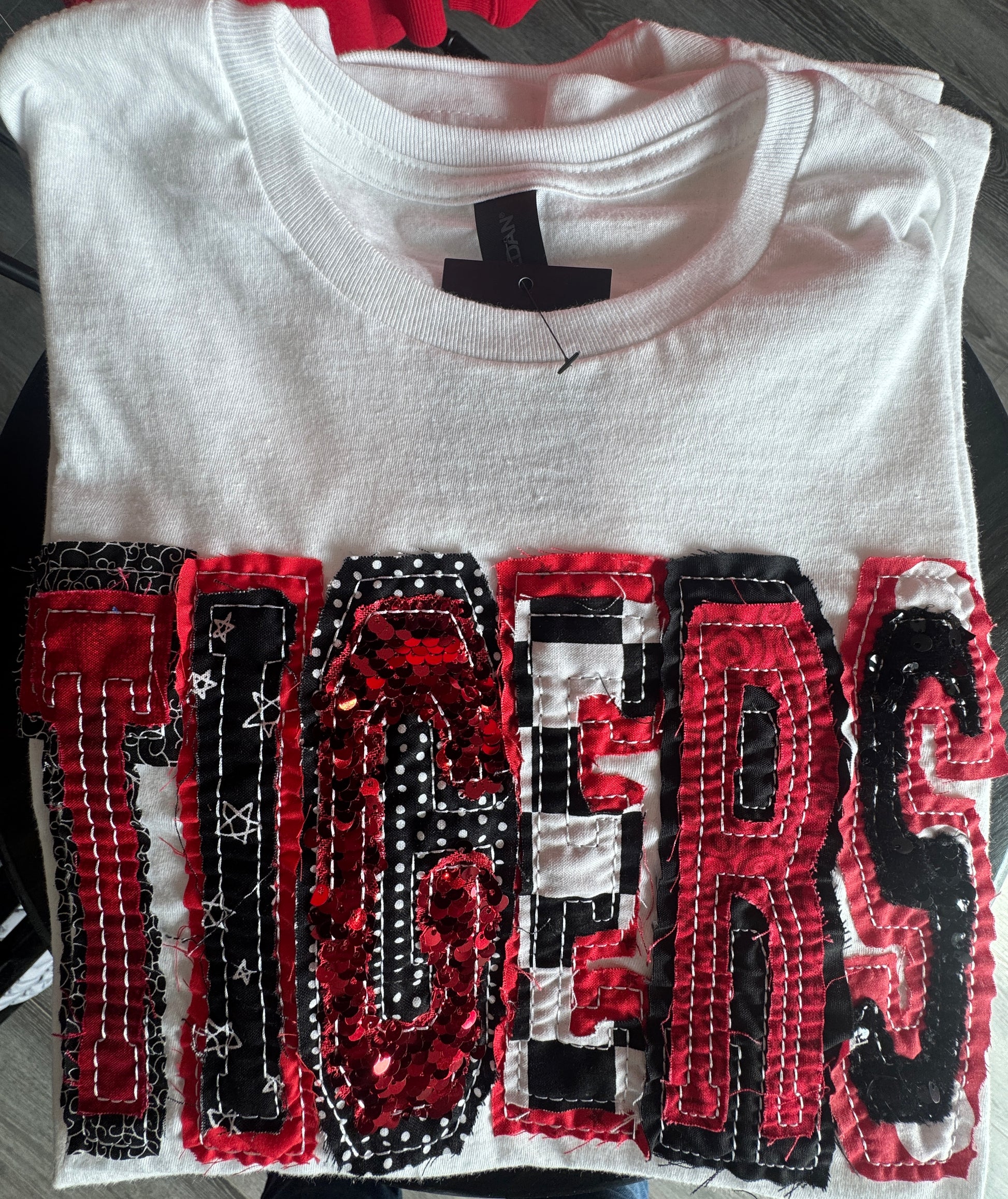 Shirts run true to size. These gorgeous, handmade tees are so unique! These have 2 different fabrics "double stacked" for each letter. These shirts will be the biggest hit in your shop!