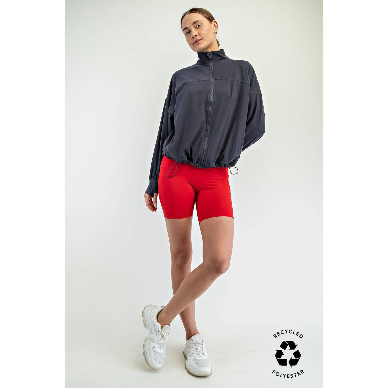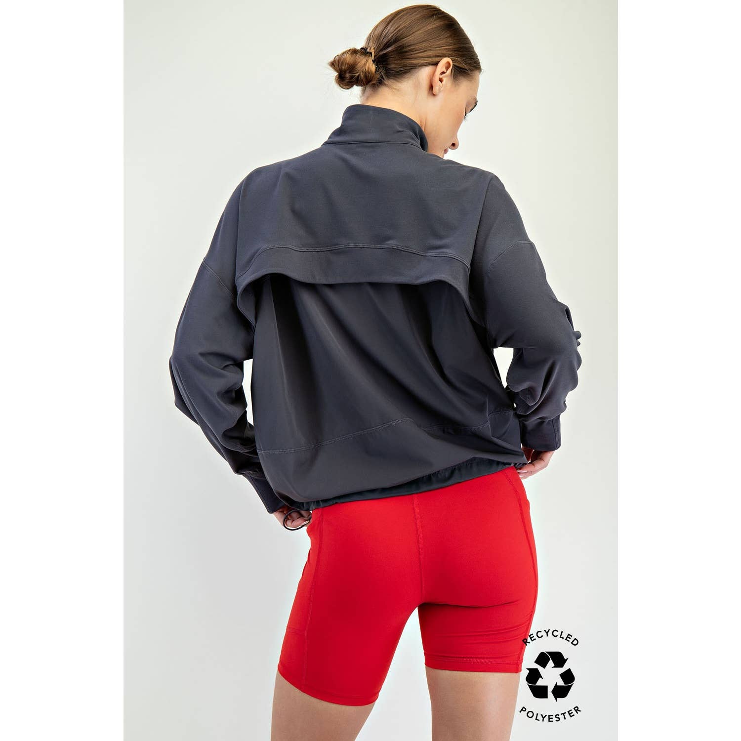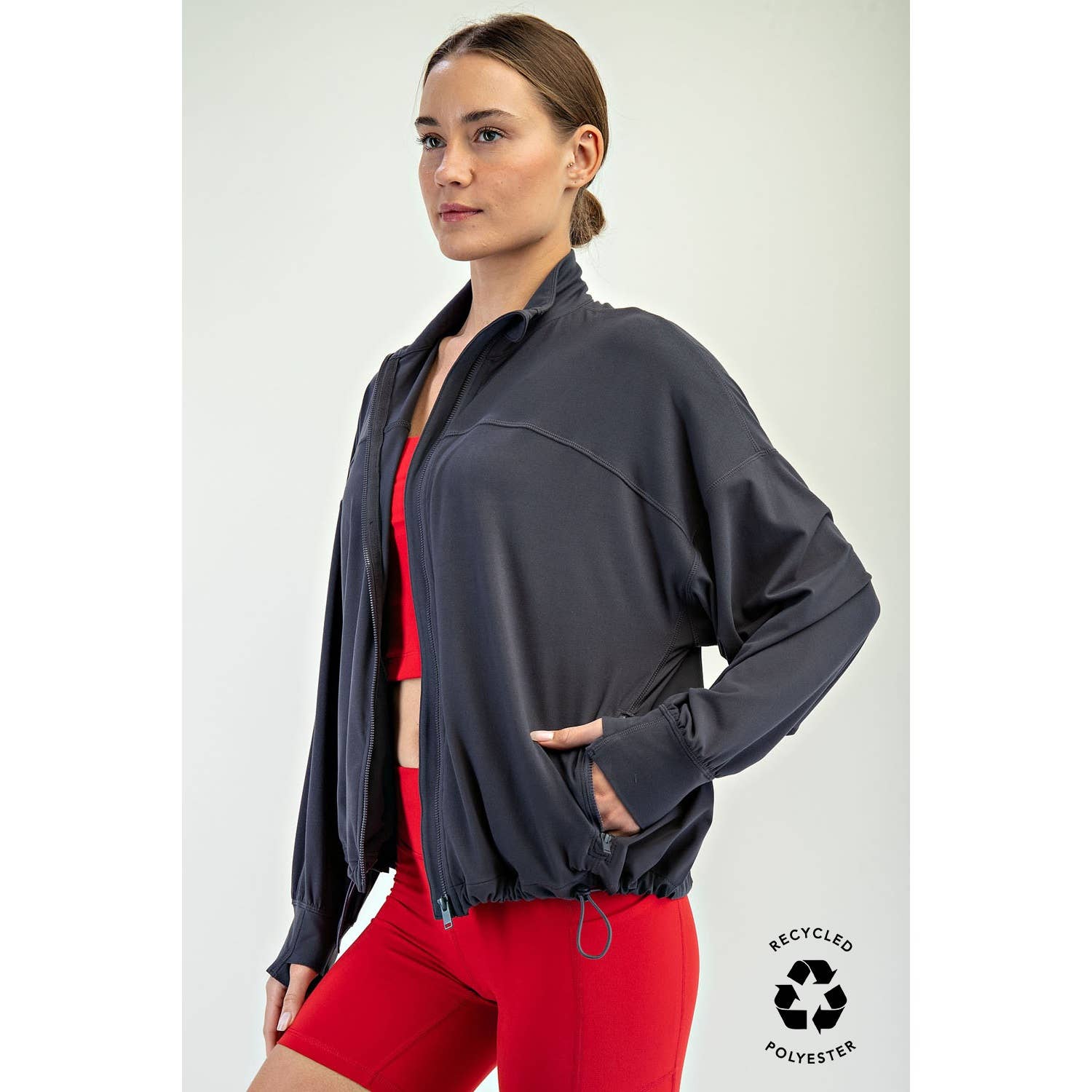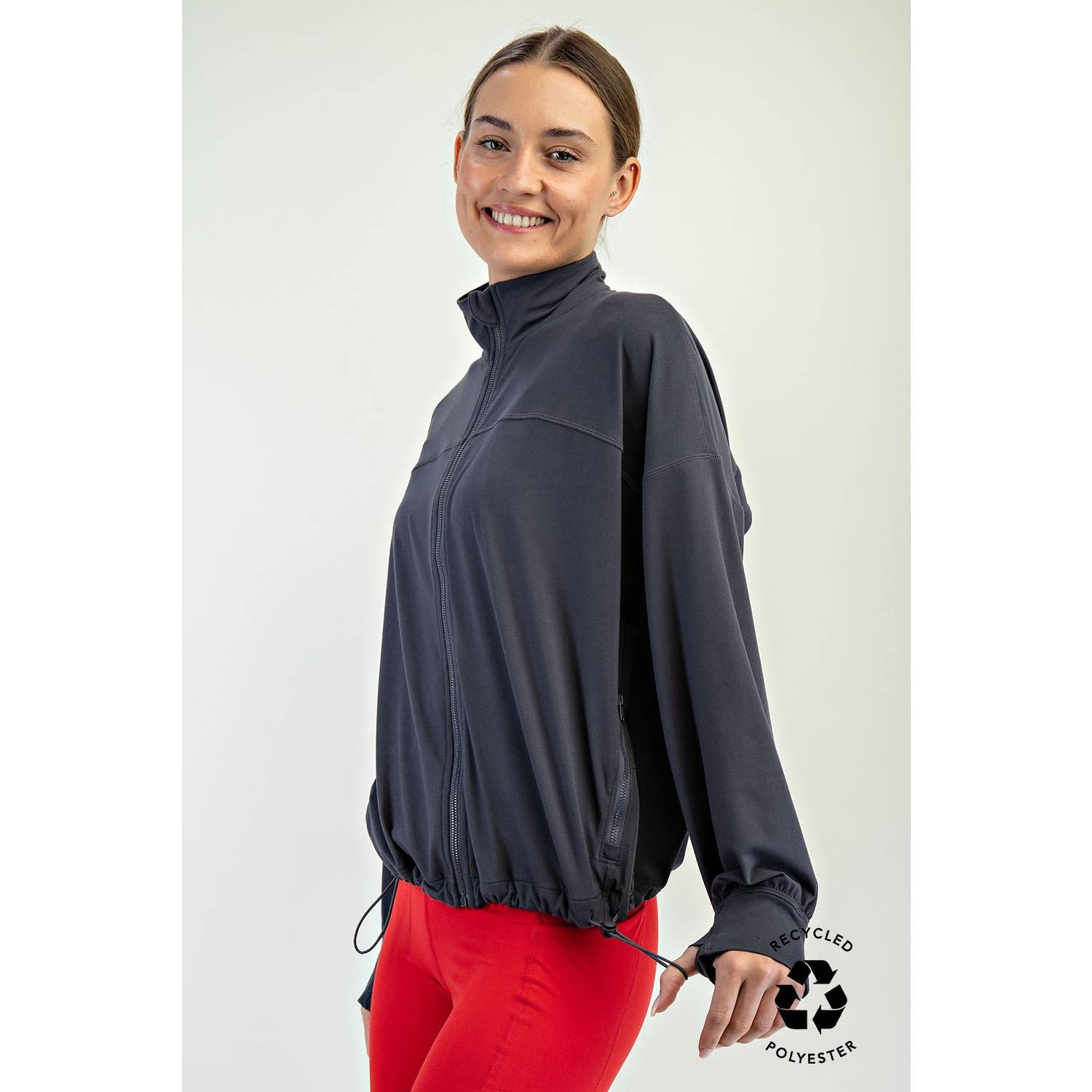 An oversized active jacket made from recycled butter-soft, lightweight fabric. Featuring secure side pockets, cinch the cords at the hem to adjust the shape, and thumbhole details, it's perfect for comfortable, stylish movement. Features: Recycled butter soft and lightweight fabric - 4-way stretch - Relaxed fit / Oversized - Full zipper closure - Mock neck - Long sleeve - Zippered secure side pocket - Cinch the cords at the hem - Thumbhole detail. Fabric: 84% Recycled Polyester Microfiber, 16% Spandex / 92% Recycled Polyester Microfiber, 8% Spandex