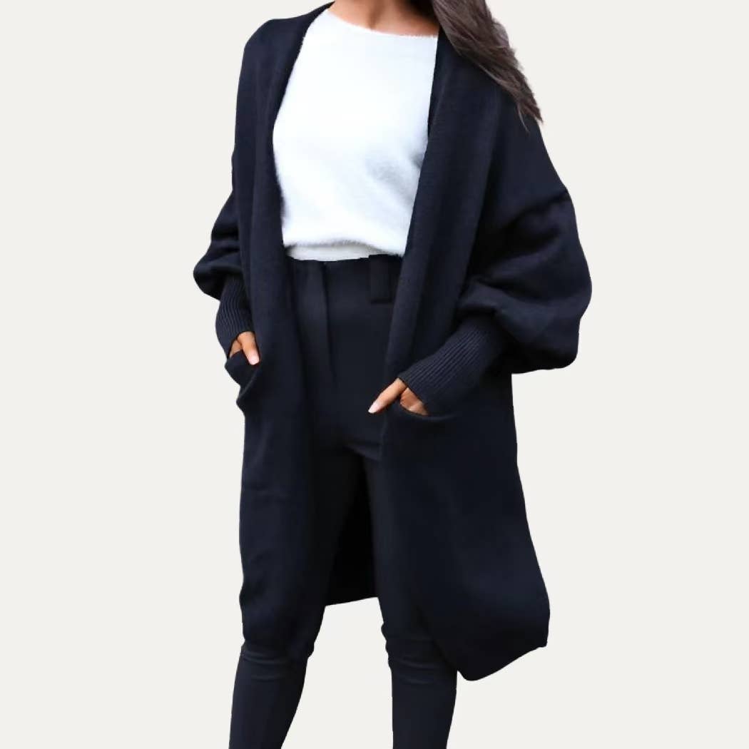 *FEATURES: Mid-weight/Stretchy sweater knit/Open front/Drop shoulders/Long balloon sleeves with fitted cuffs/Two pockets