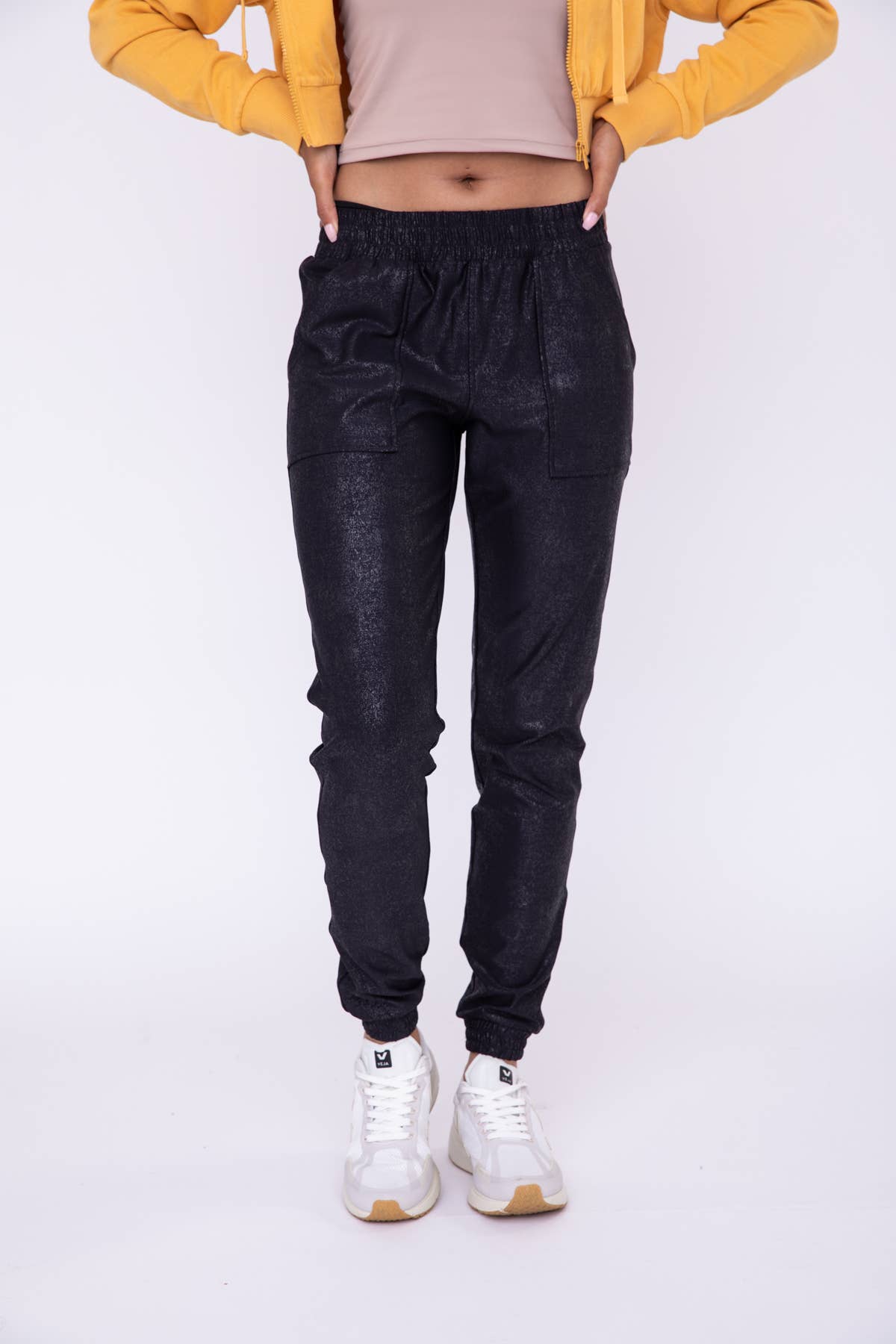 Your favorite pair of joggers but upgraded. These high-wasited joggers feature a foil print, large pockets, and an elastic waistband and ankle cuffs. 88% Polyester 12% Spandex Moisture-wicking. Four-way stretch