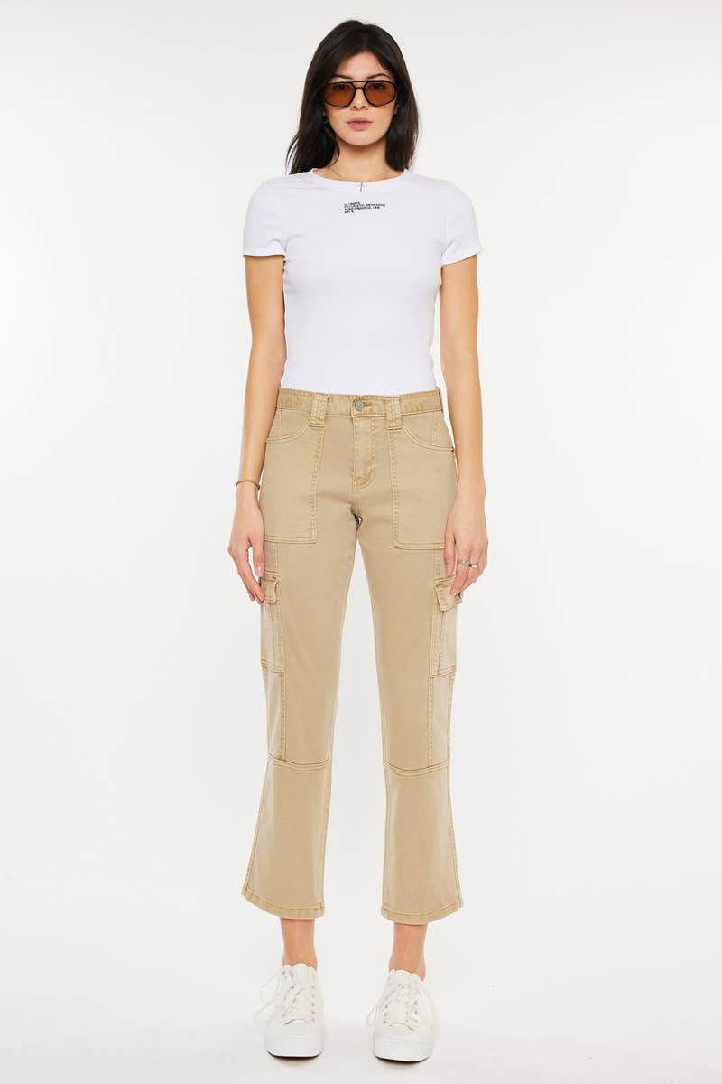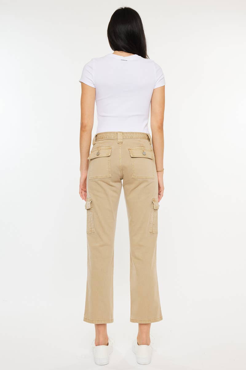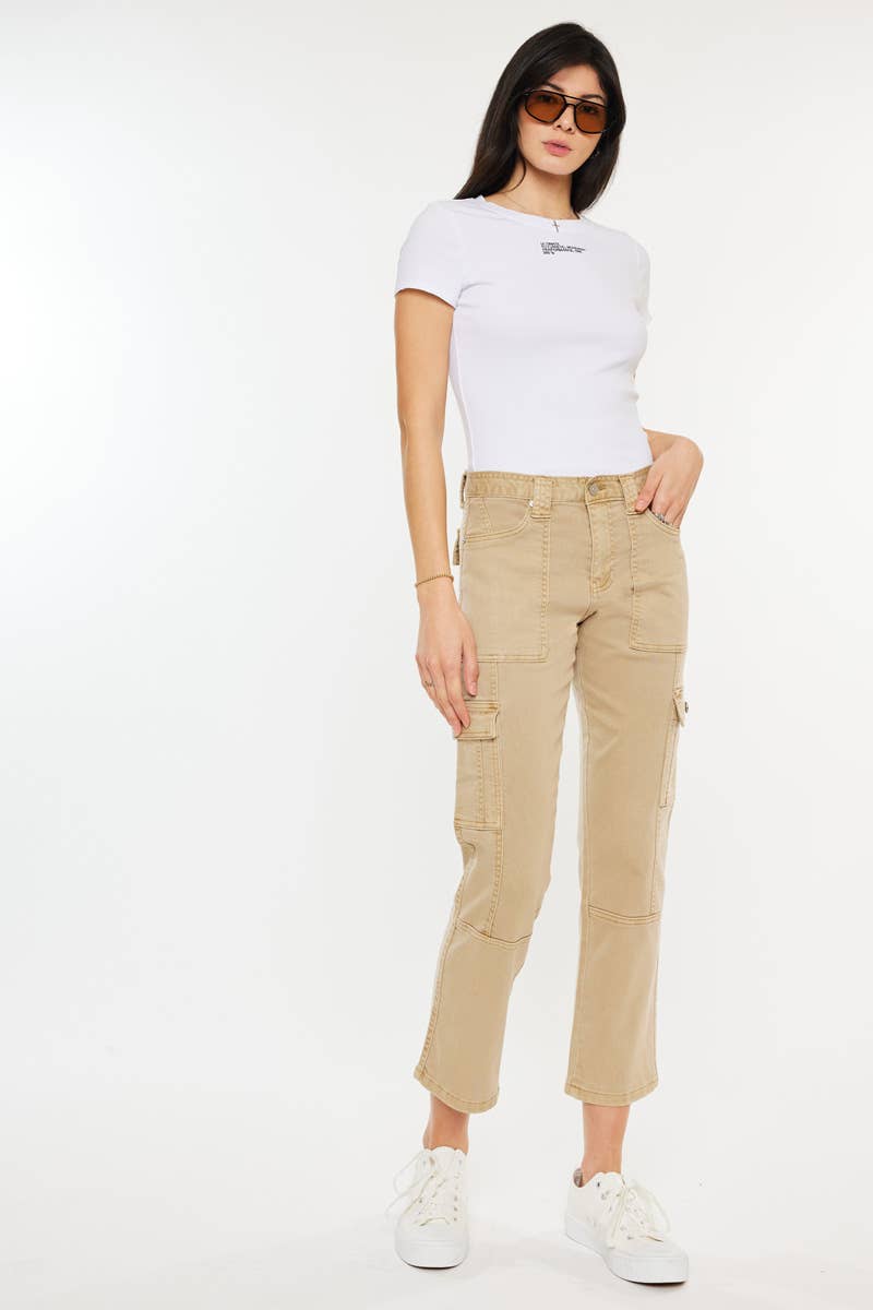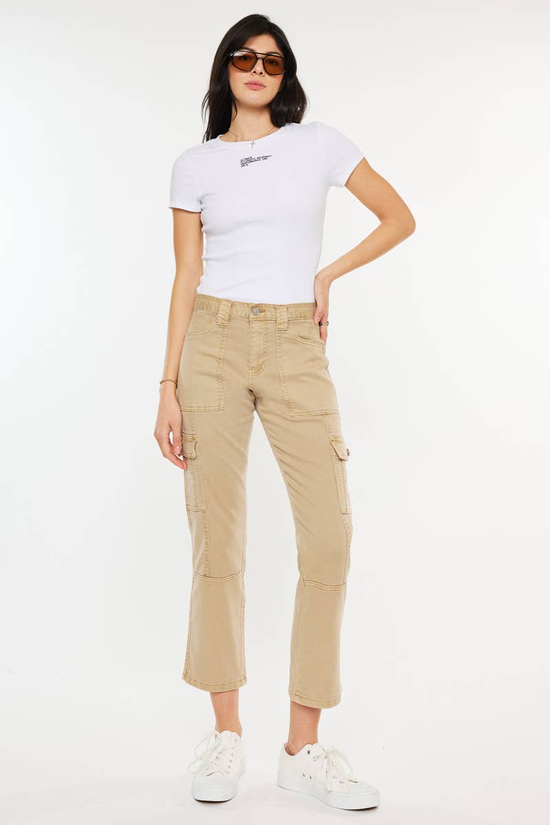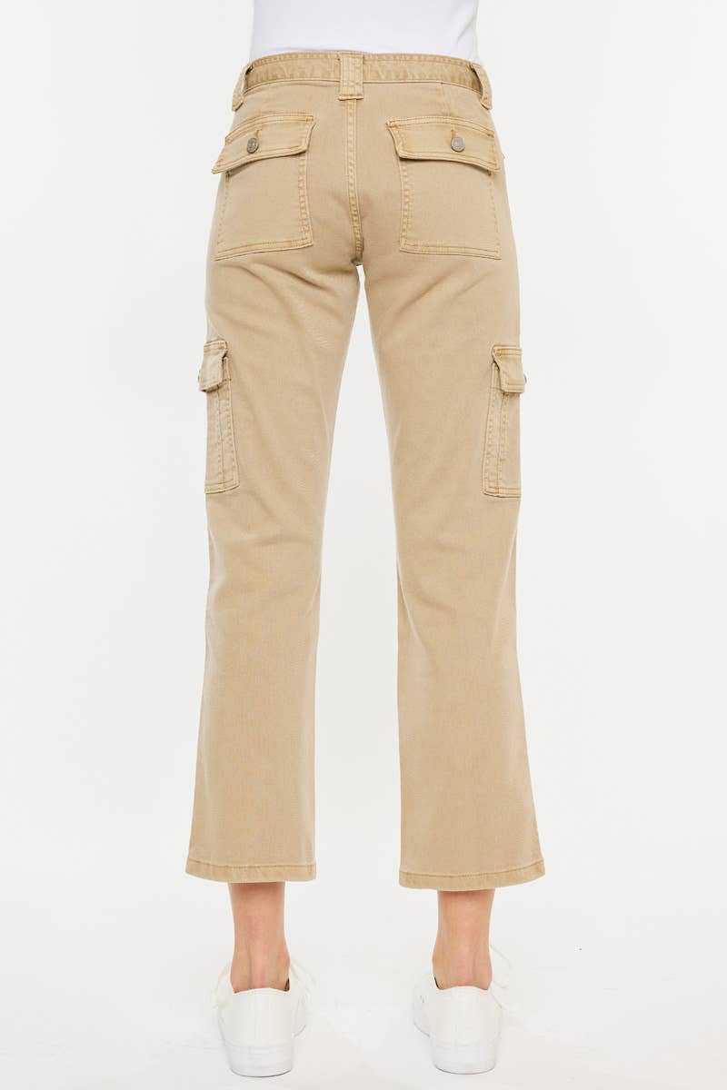 High rise, straight cargo pants. Comfort stretch. Cargo pocket detail. Regular hem. Back dart detail. Zipper fly. Rise 10 1/4”, inseam 27” for size 5/26 98% COTTON, 2% SPANDEX 12.5OZ