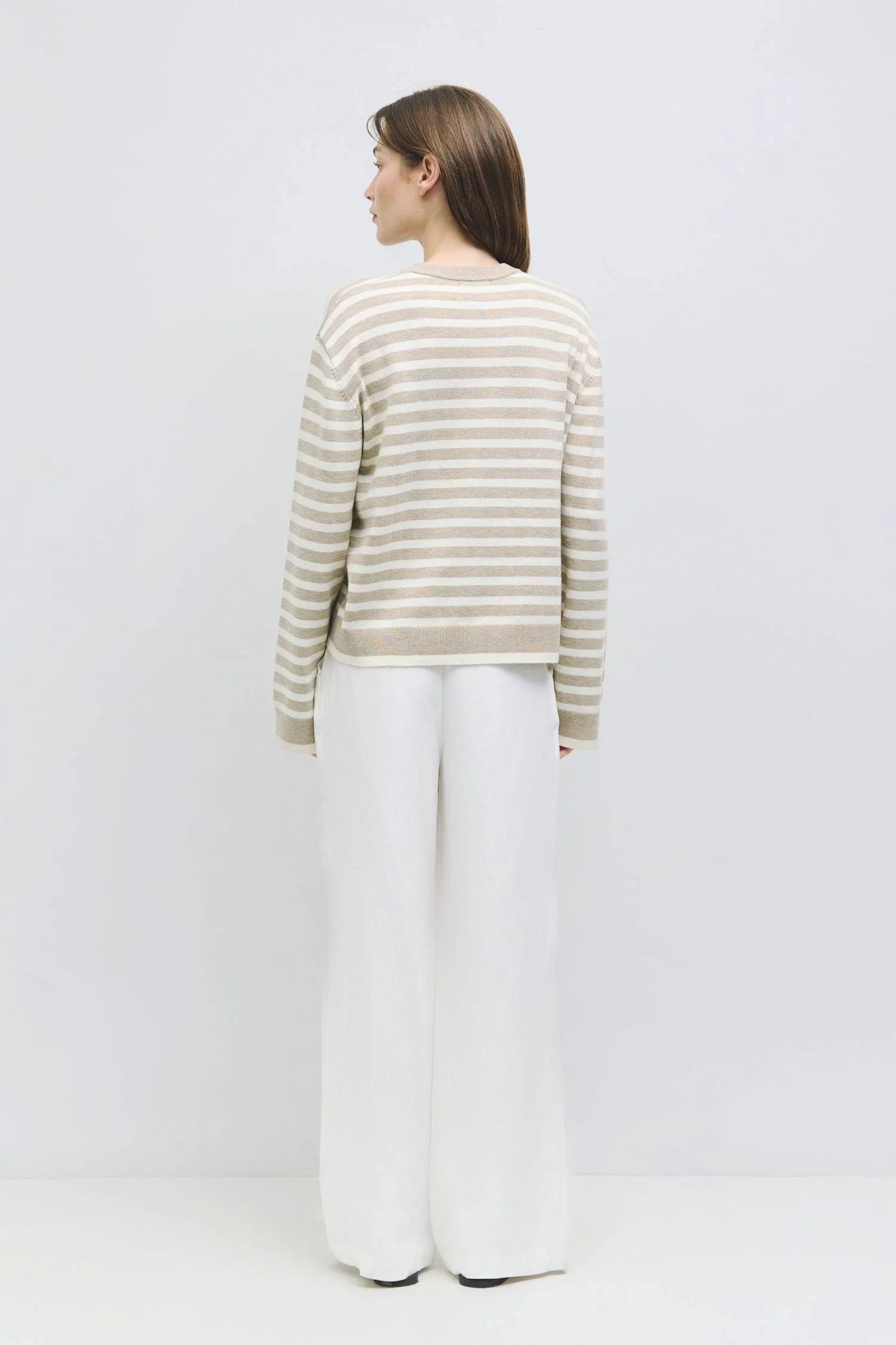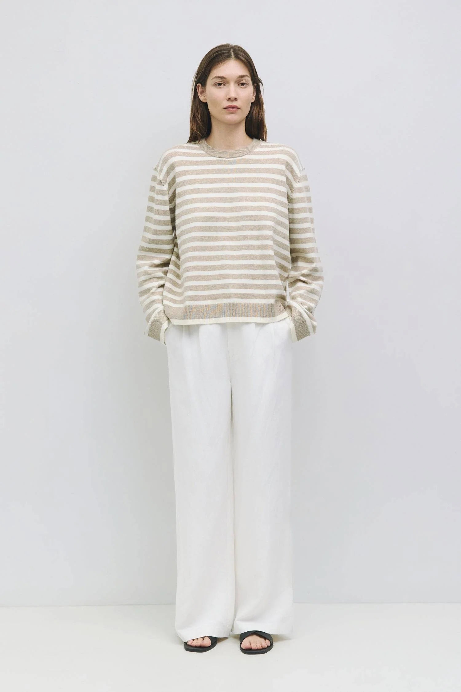 The Klein Sweater is a striped pullover sweater designed with a boyfriend fit for a laid-back, cozy look. The bell sleeves and crew neckline add a relaxed, yet polished touch to the mid-weight knit. Perfect for layering or wearing on its own for a casual day out.