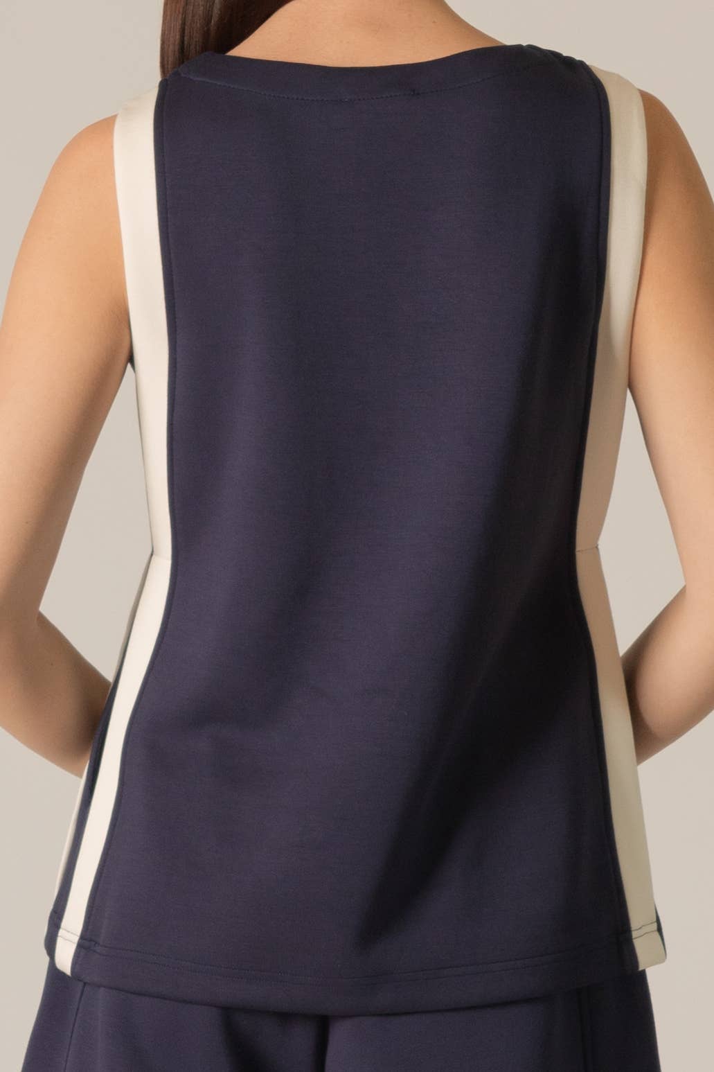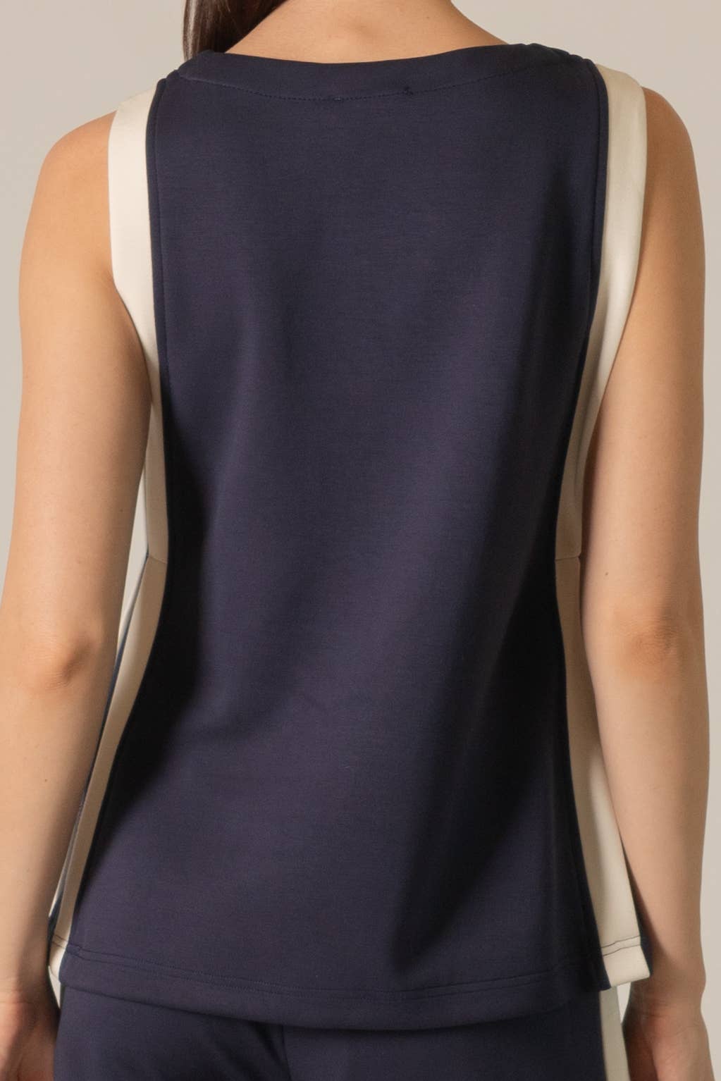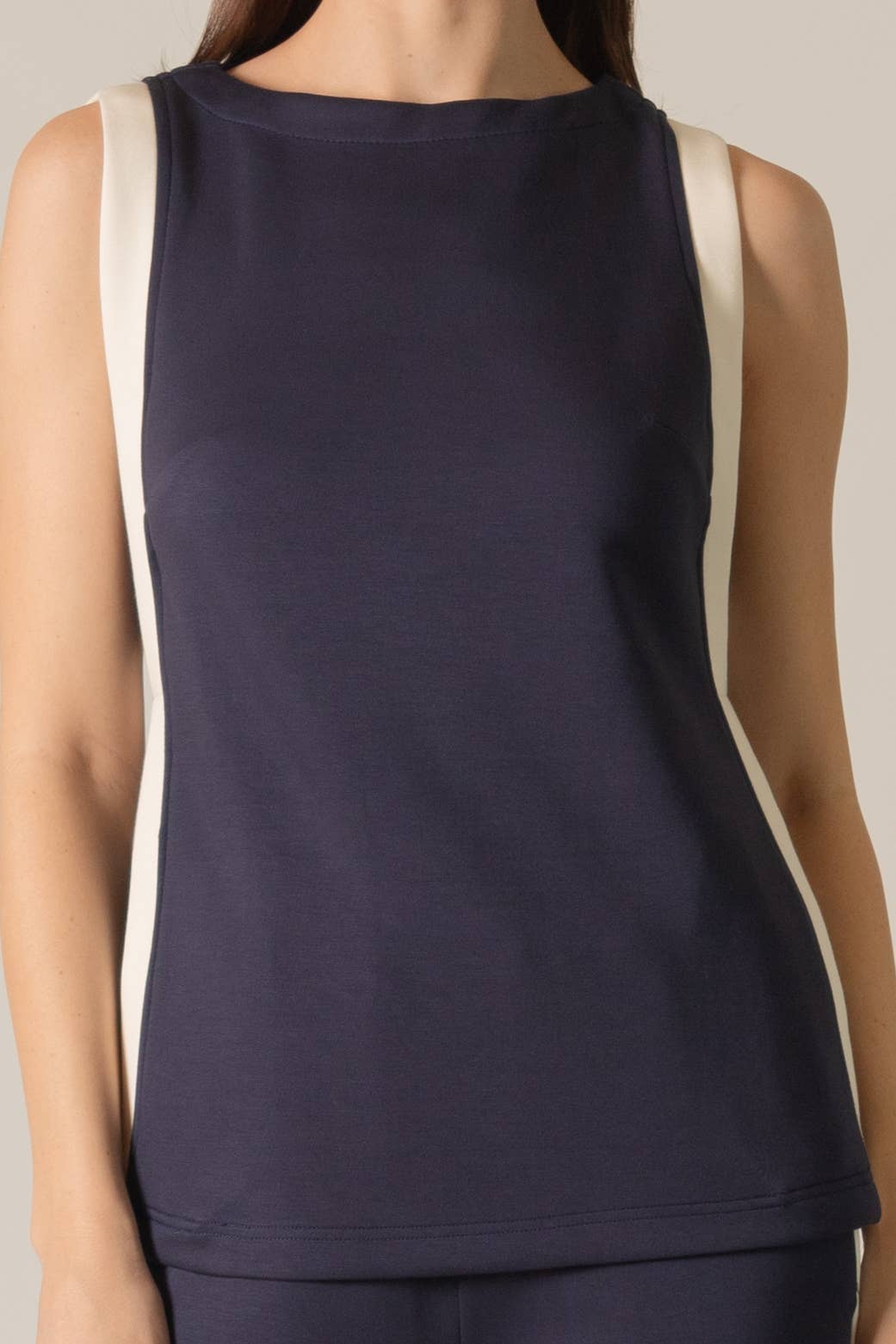 Details: - P. CILL Butter Modal fabrication - Contrast border details - Side seam pockets - Sleeveless - High neckline - Tailored fit - Tunic length Fabrication: 48% Modal, 48% Polyester, 4% Spandex