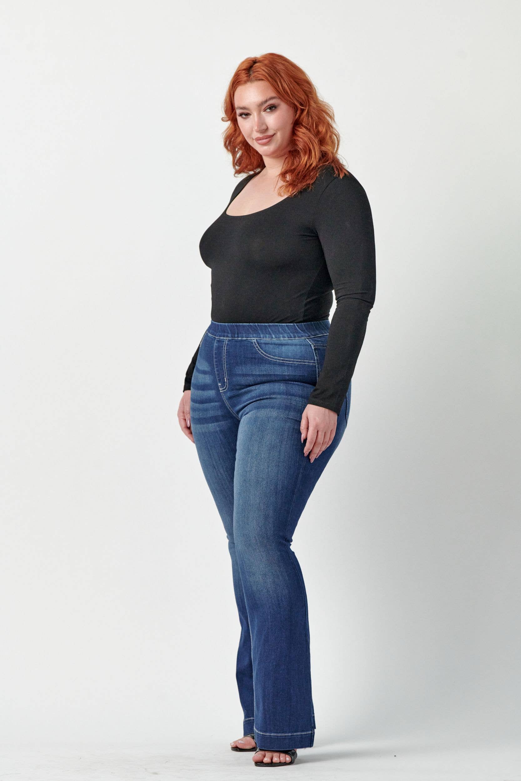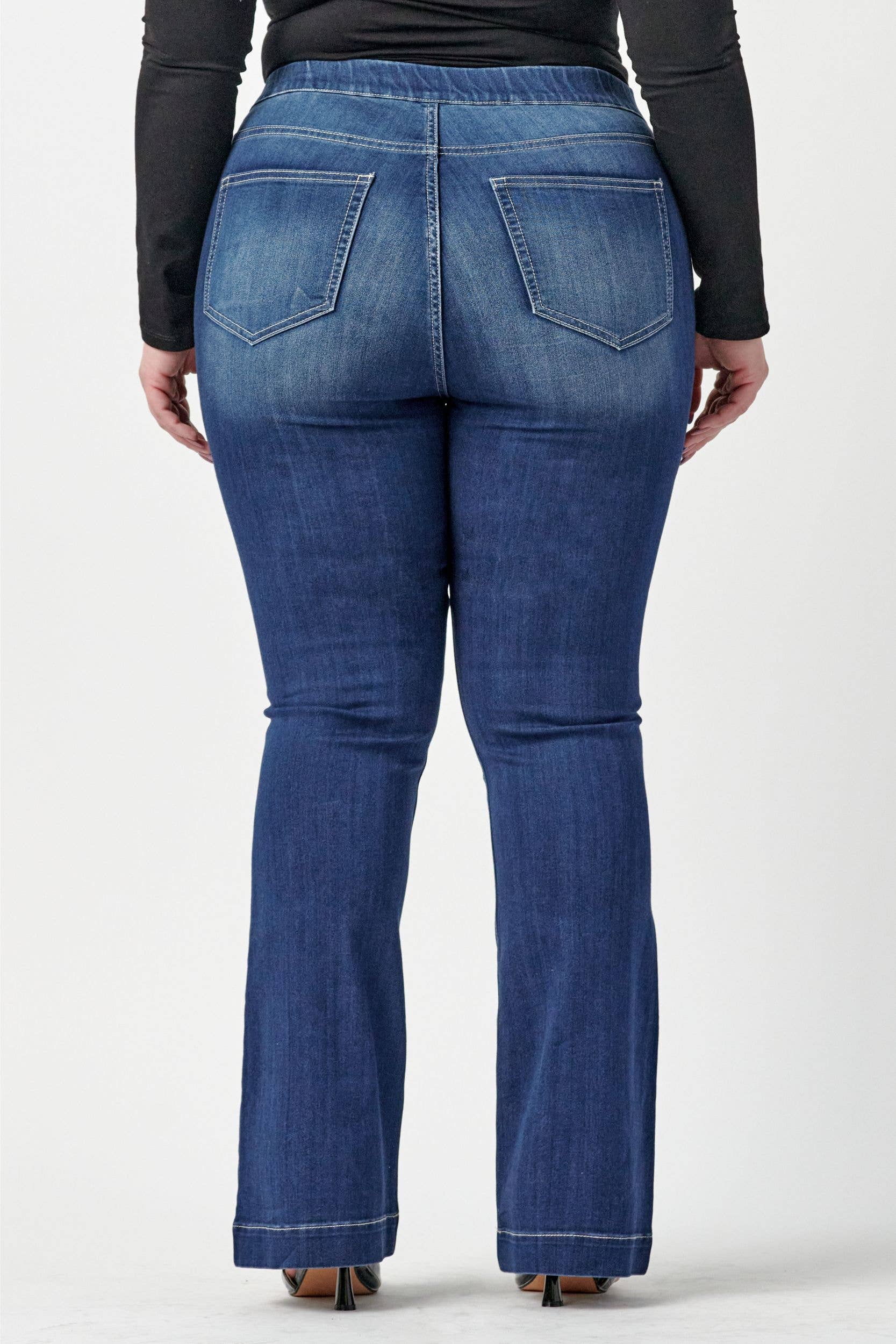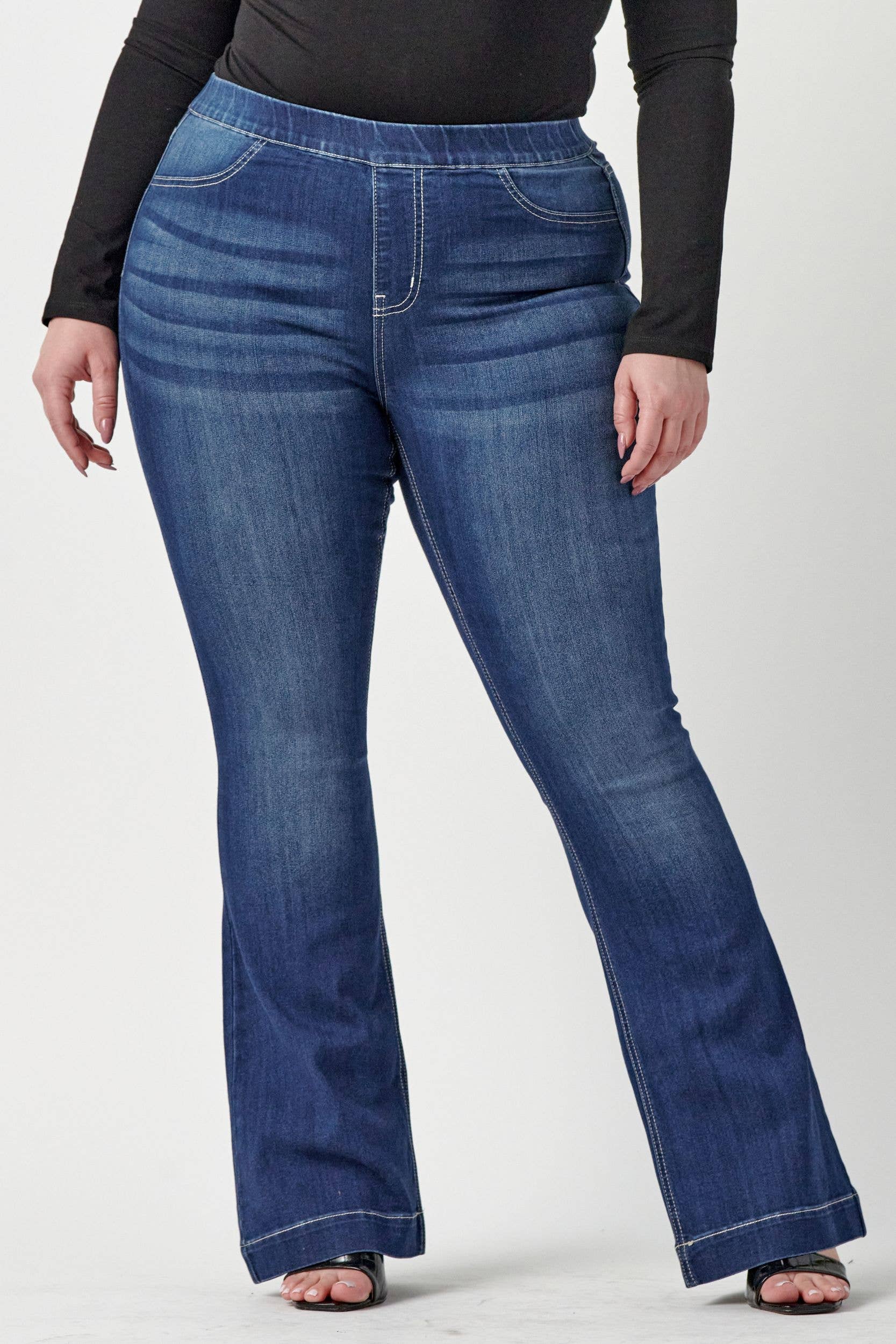 Get comfortable and trendy in these ultra-stretchy jeans in Plus. The dark wash flared jegging features a flattering flared fit, a faded wash, and light whisker detail. Additionally, it has two faux front pockets and two real back pockets. Mid-rise Flare jegging Dark denim Elastic 2 mock front pockets // 2 back pockets Import Inseam: 32 1/2” Rise: 11 1/2” Fabric Content: 57% Cotton 26% Polyester 15%Rayon 2% Spandex